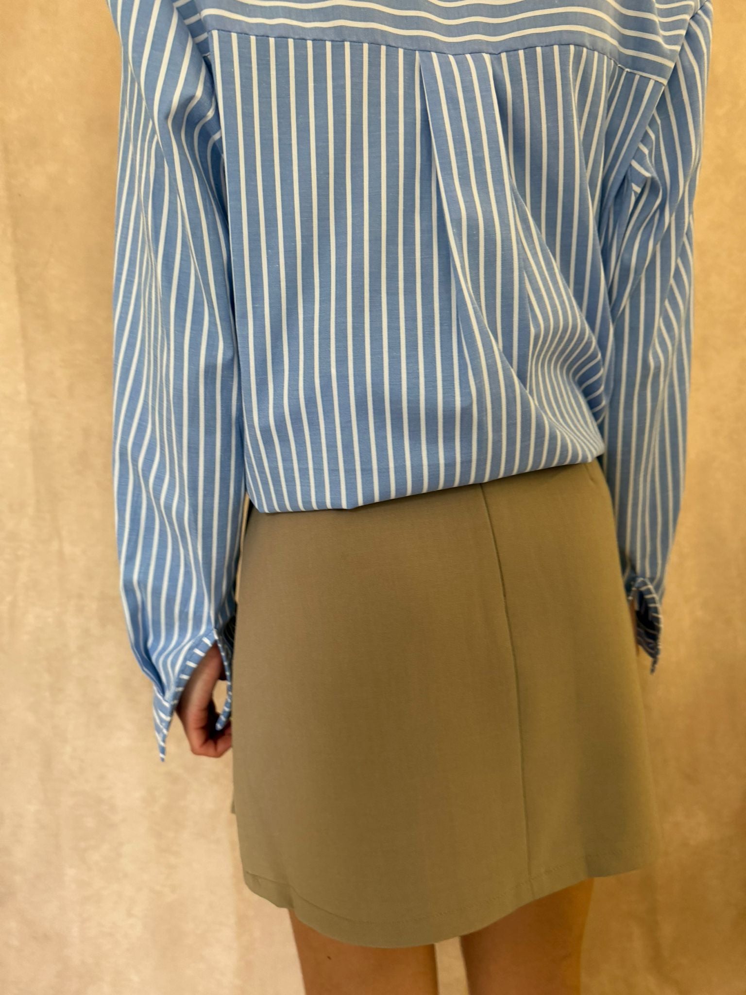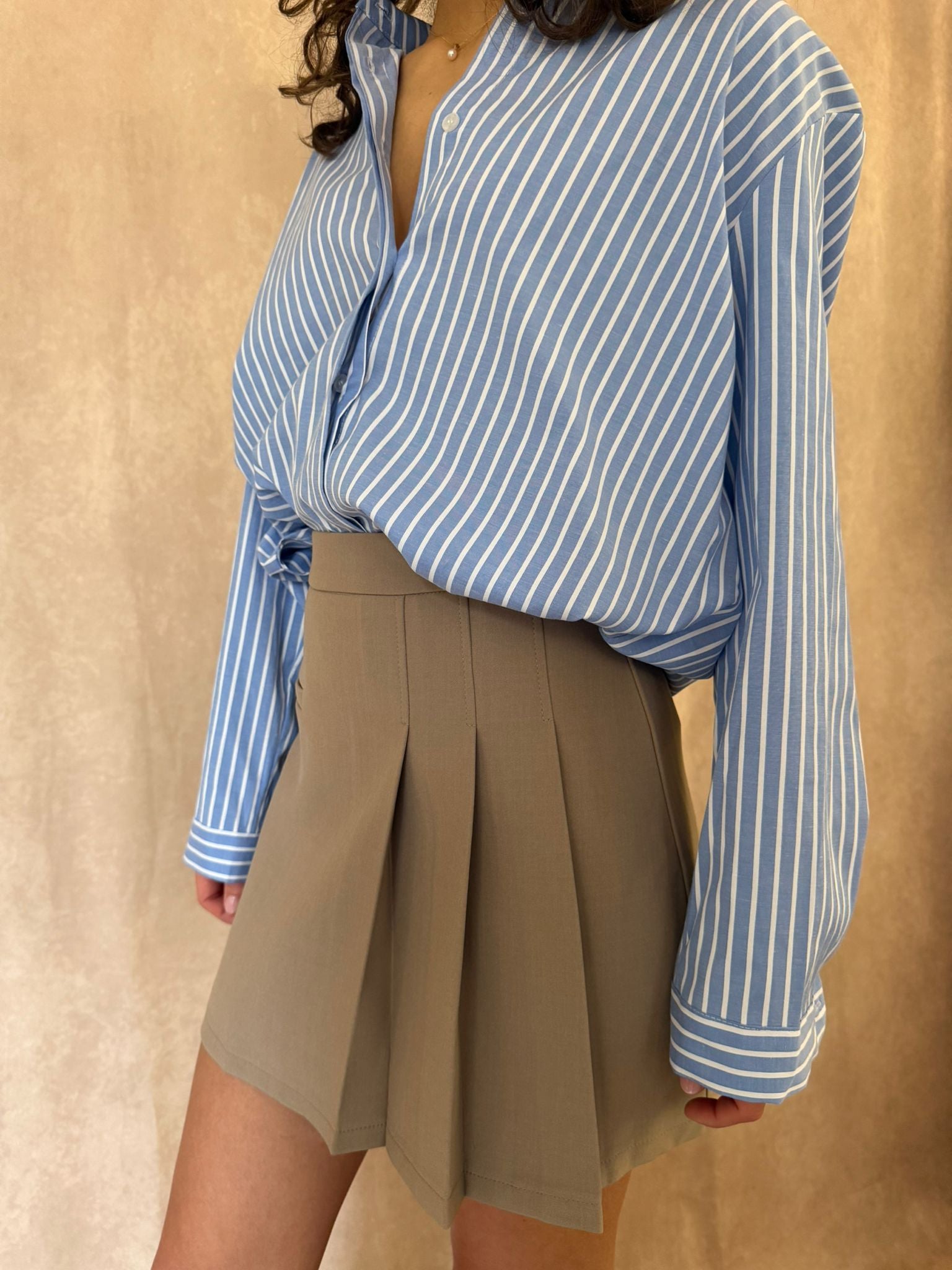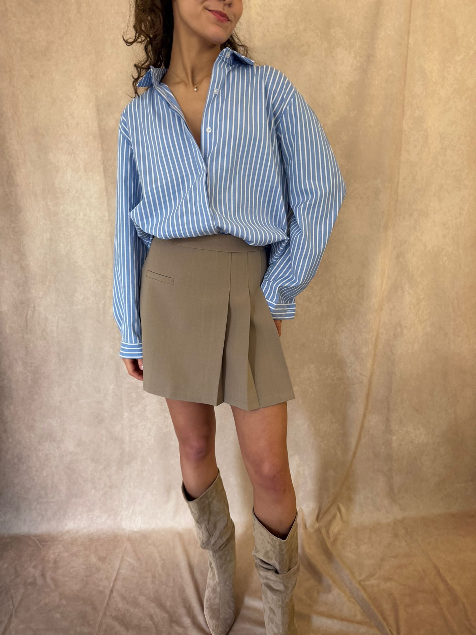 Jupe beige à la coupe droite avec détail plissé sur le devant pour une allure chic et moderne. Sa taille haute et son style tailleur en font une pièce élégante, facile à associer avec une chemise ou un pull.