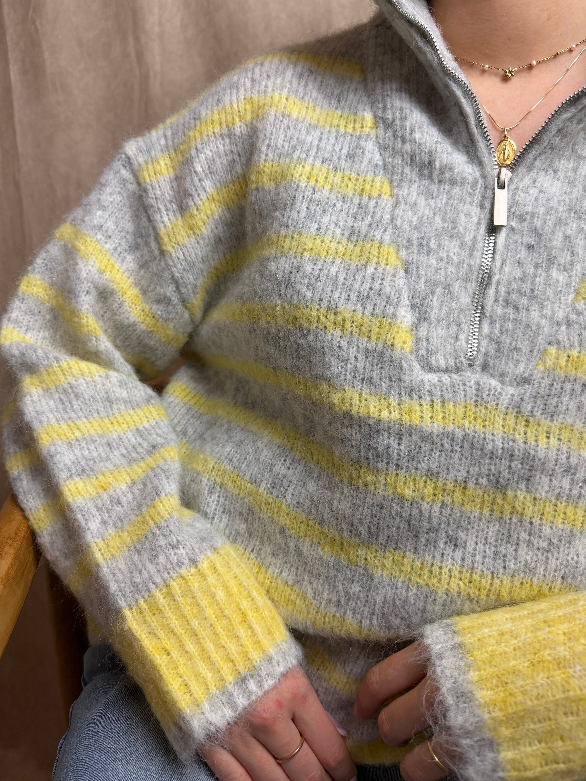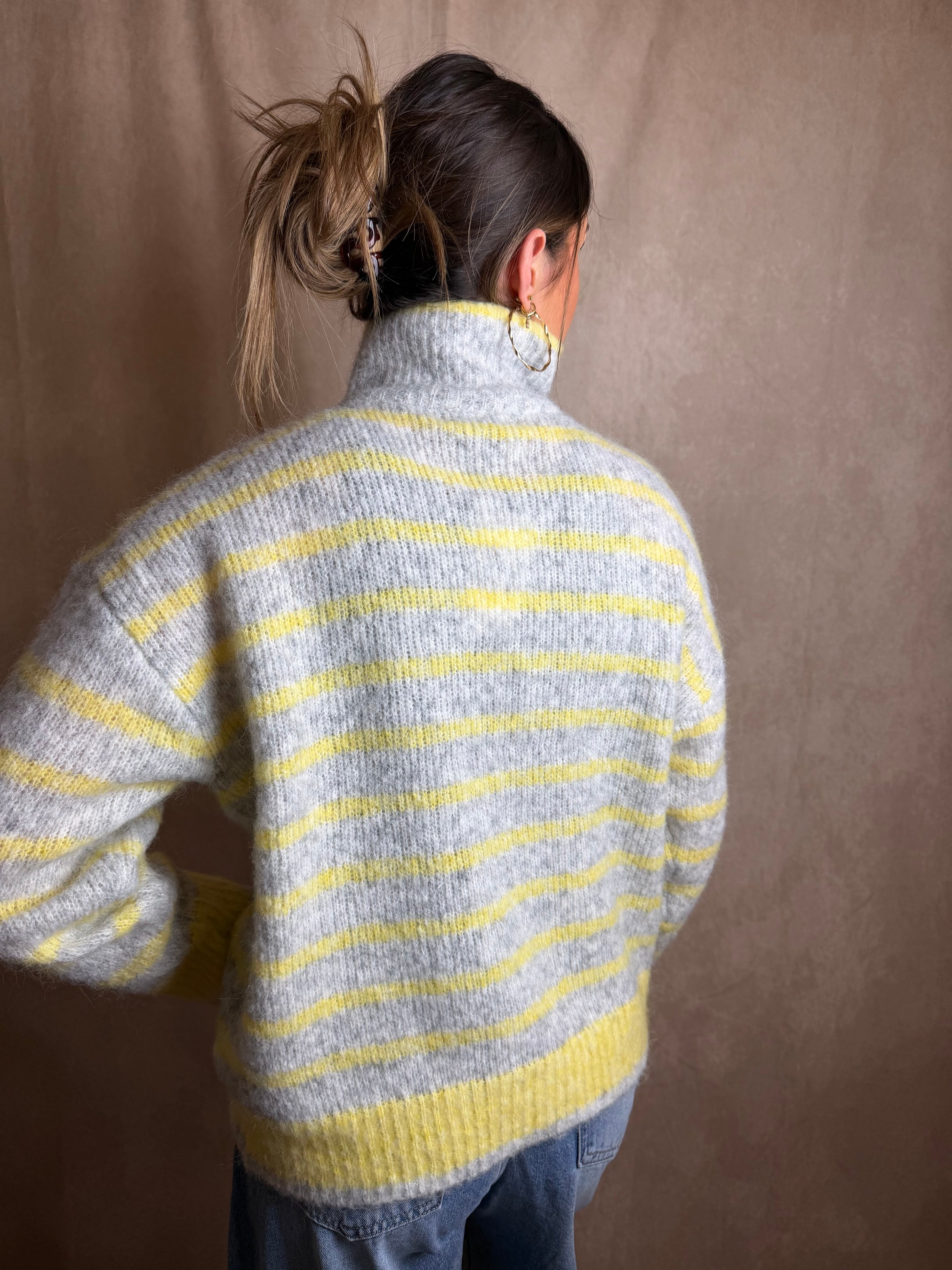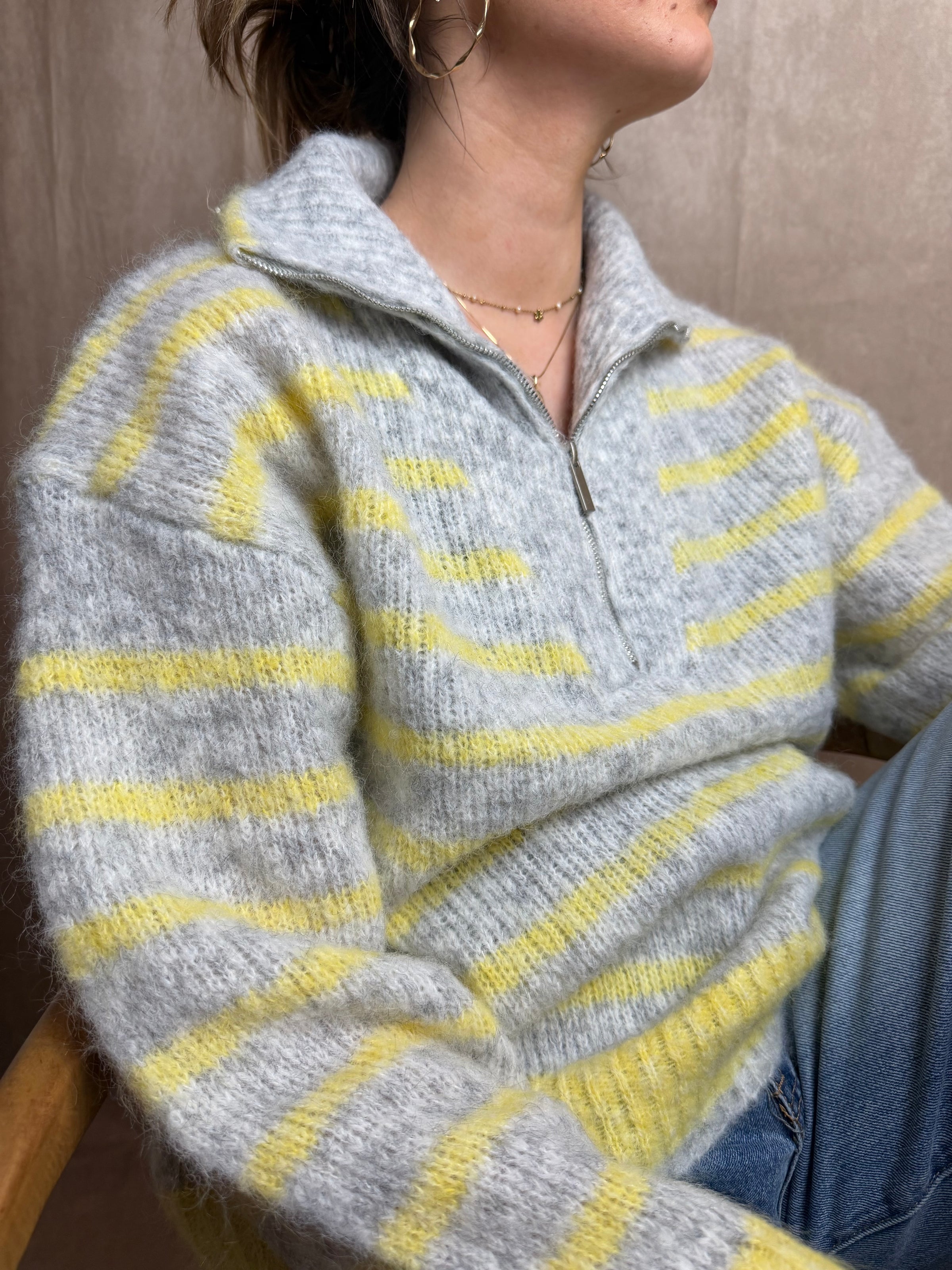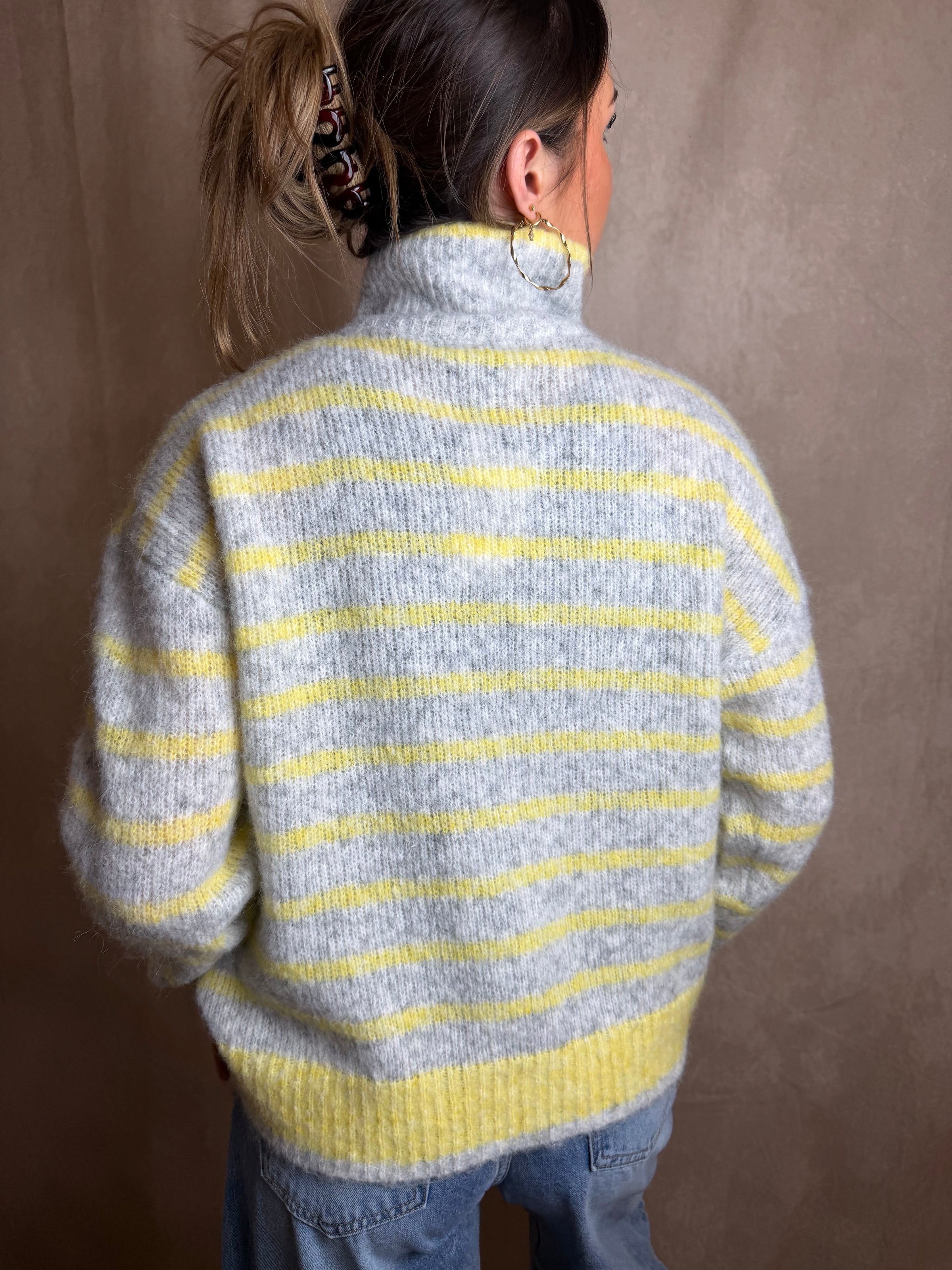 Ce pull à rayures gris et jaune est une pièce idéale pour la mi-saison.