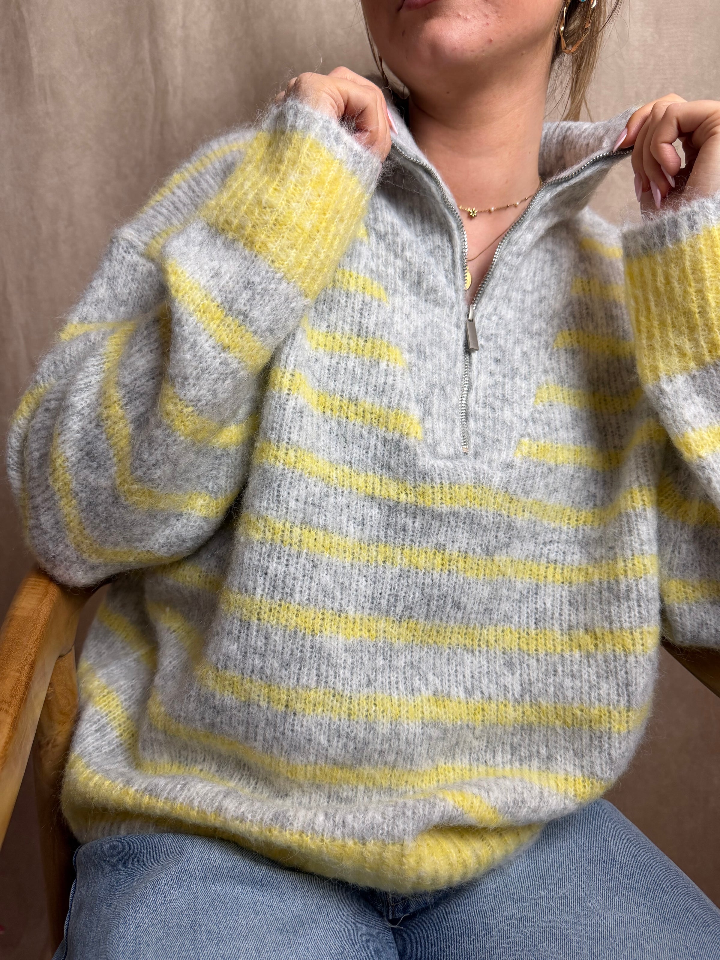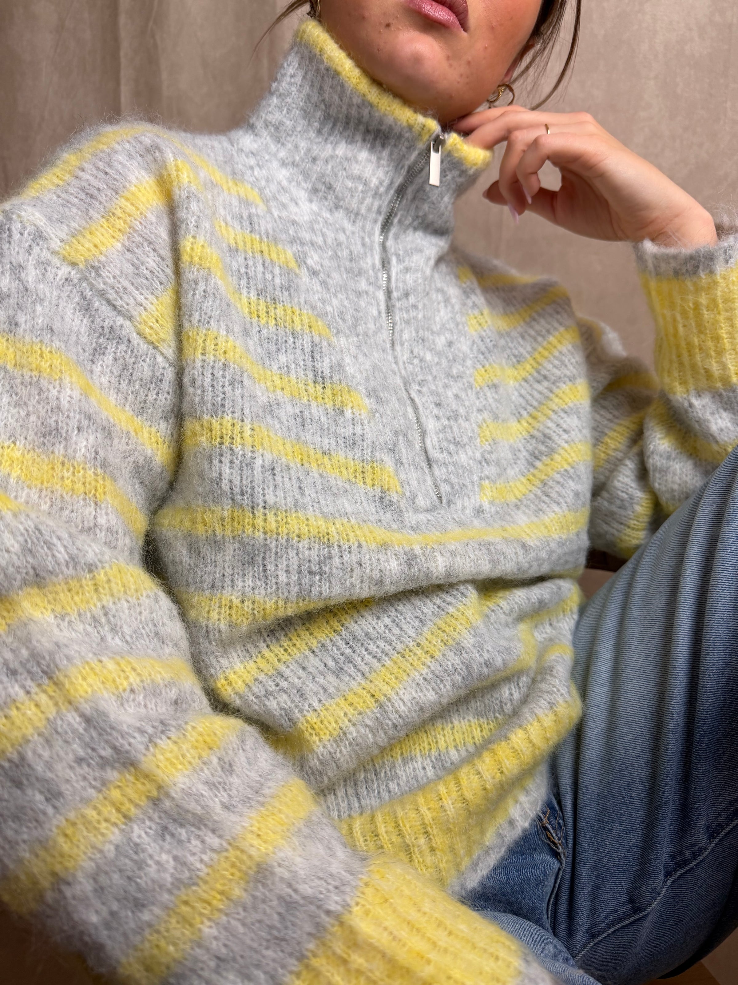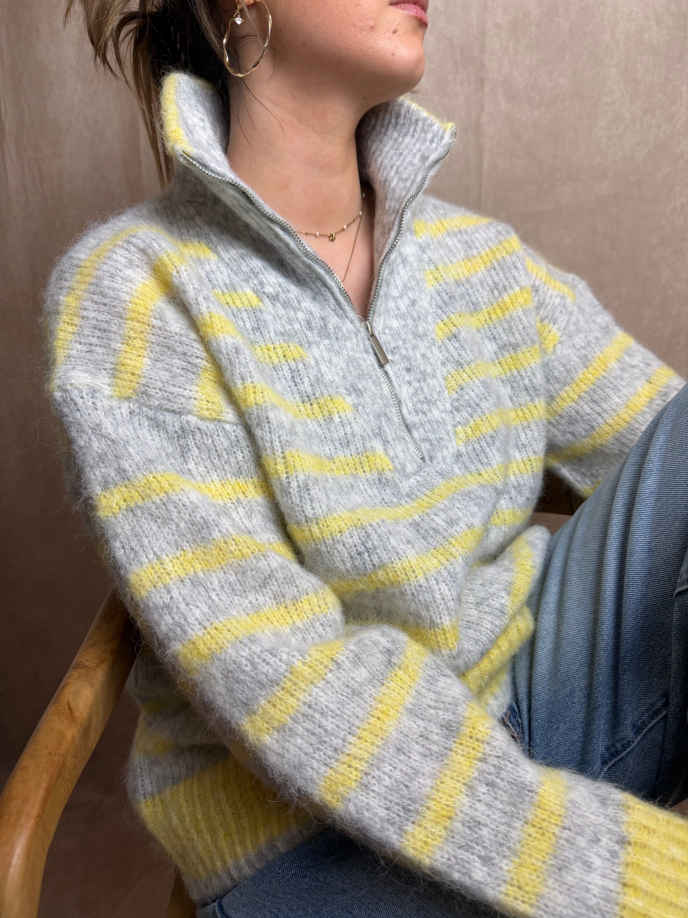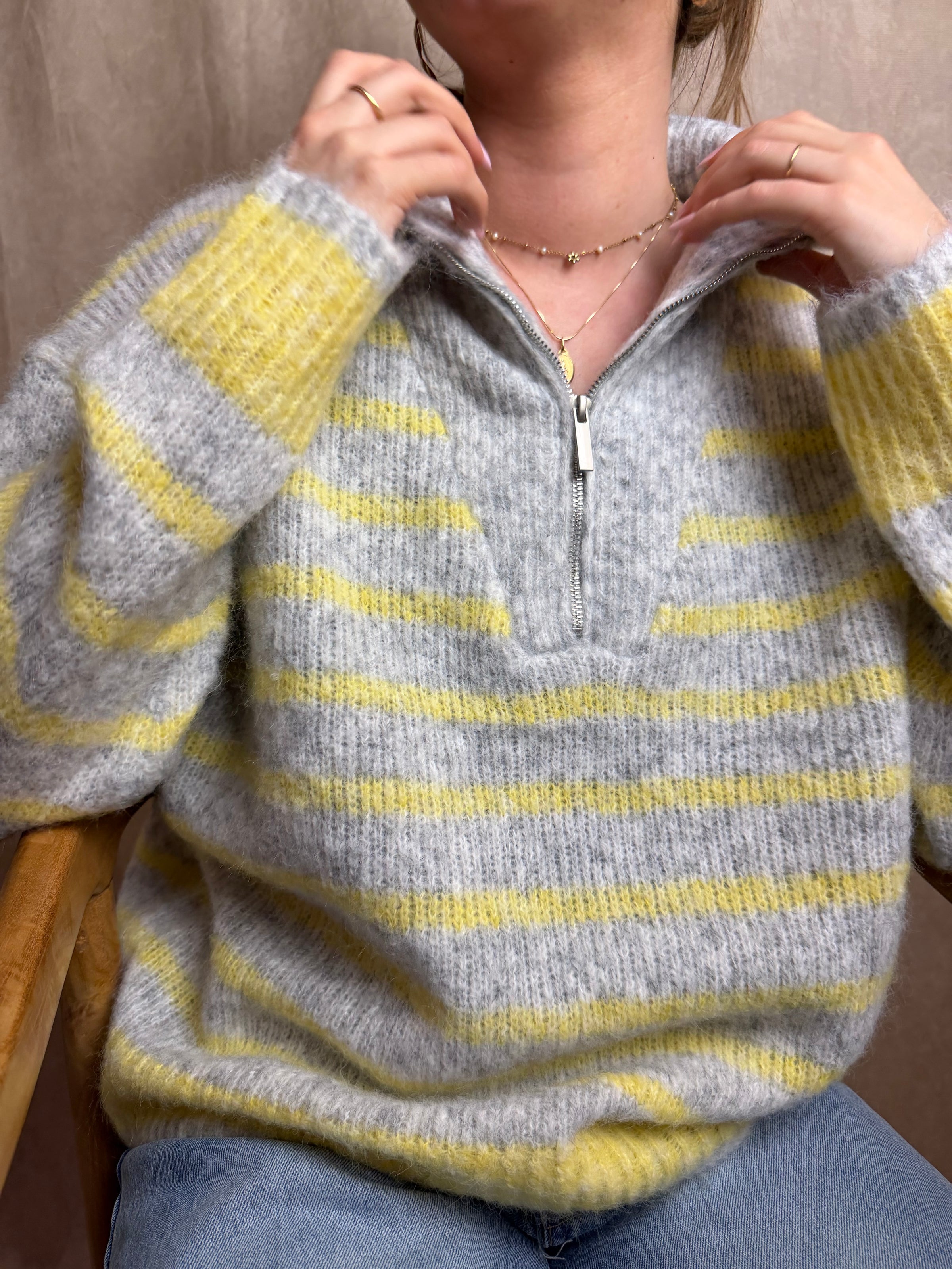 Ce pull à rayures gris et jaune est une pièce idéale pour la mi-saison.